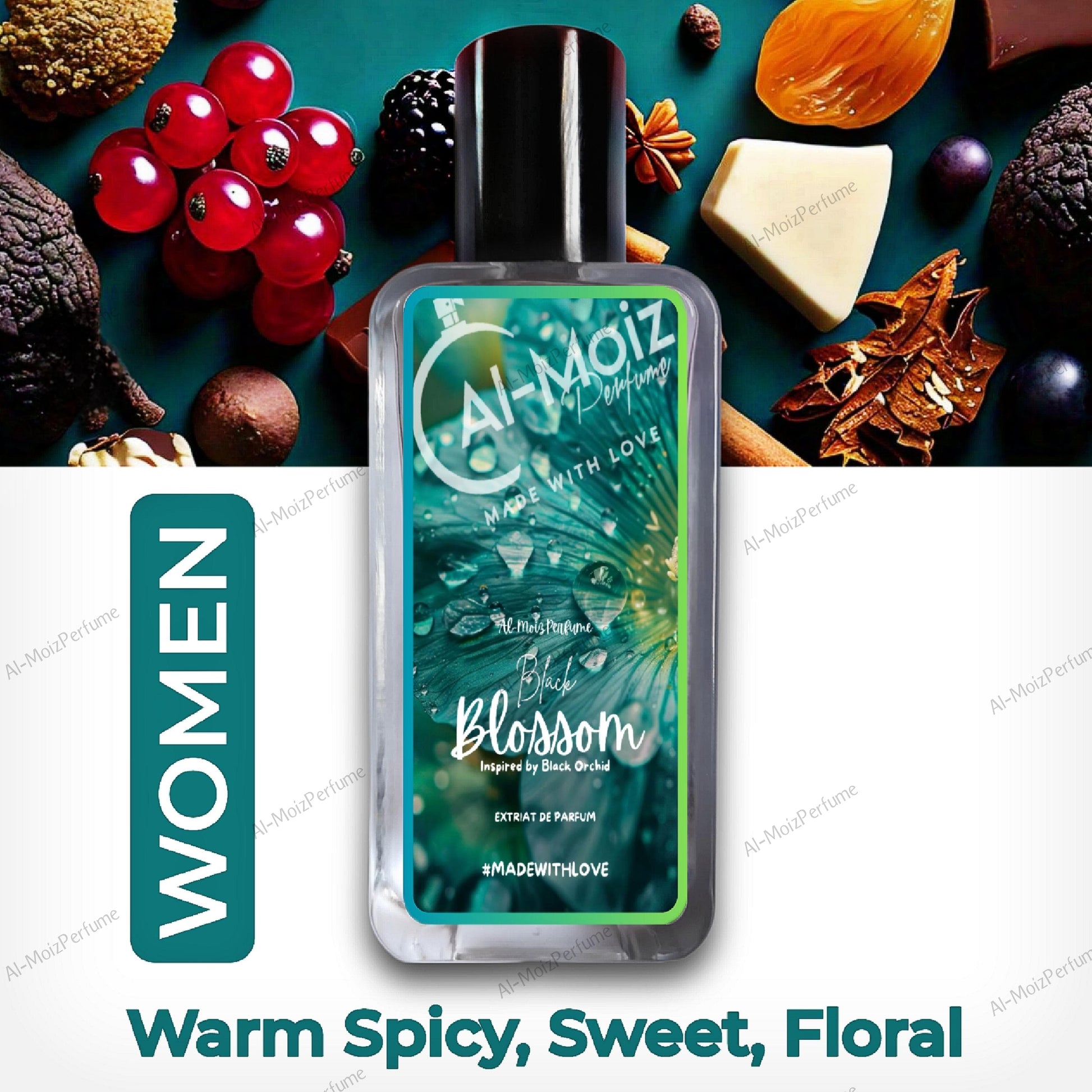 Black Blossom by Al-Moiz Perfume is a Amber Floral fragrance for women. Top notes are Truffle, Gardenia, Black Currant, Ylang-Ylang, Jasmine, Bergamot, Mandarin Orange and Amalfi Lemon. Middle notes are Orchid, Spices, Gardenia, Fruity Notes, Ylang-Ylang, Jasmine and Lotus. Base notes are Mexican chocolate, Patchouli, Vanille, Incense, Amber, Sandalwood, Vetiver and White Musk.