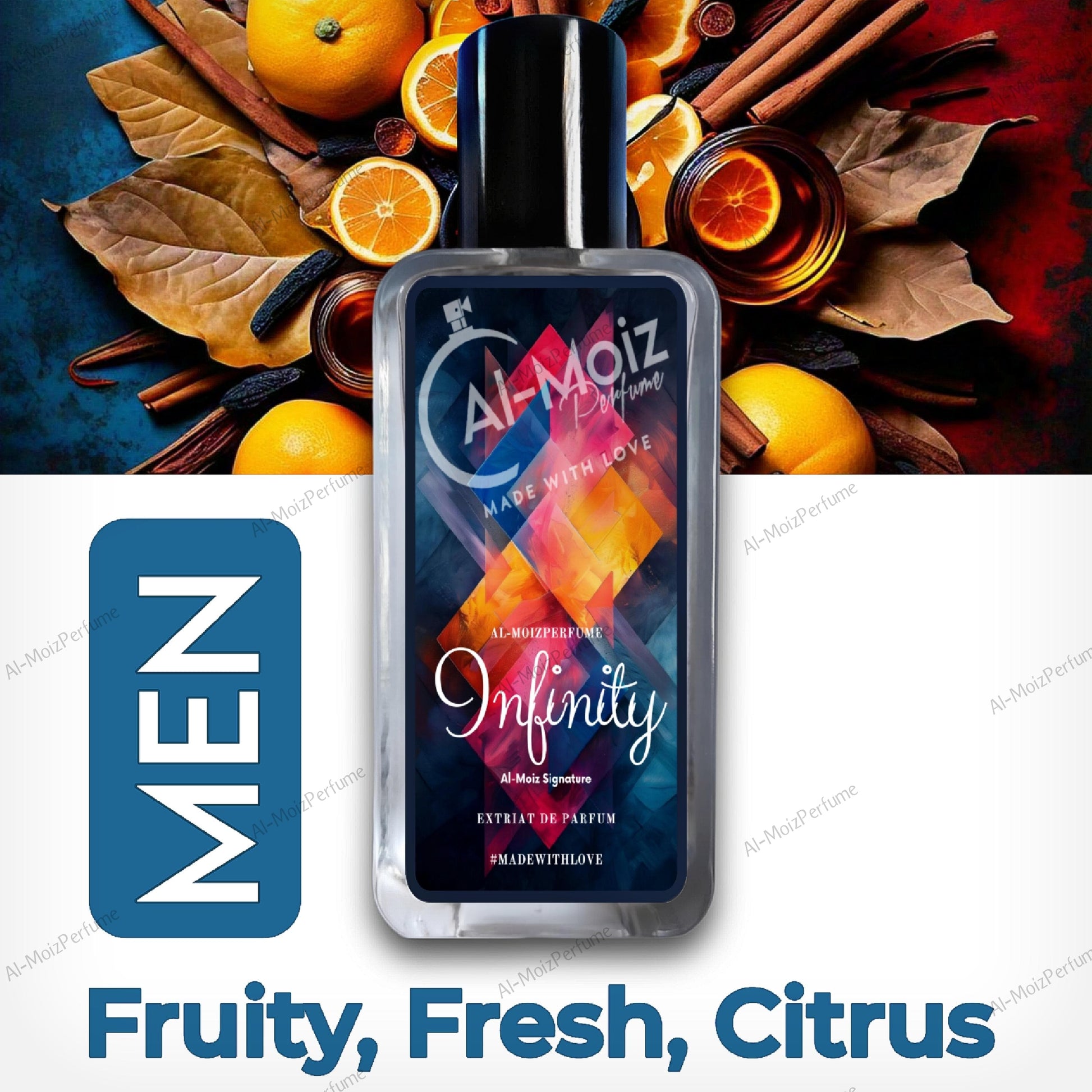 Infinity by Al-MoizPerfume is an aromatic aquatic fragrance crafted for men by Olivier Polge. It opens with a refreshing blend of apple, grapefruit, coriander, basil, lemon, and cinnamon. You’ll find a harmonious mix of watery notes, plum, ginger, orange blossom, and cardamom at its heart. The base lingers with rich ambergris, warm amber, tobacco, cedar, musk, patchouli, and driftwood, creating a captivating and lasting impression. Perfect for the modern man seeking a bold yet balanced scent.